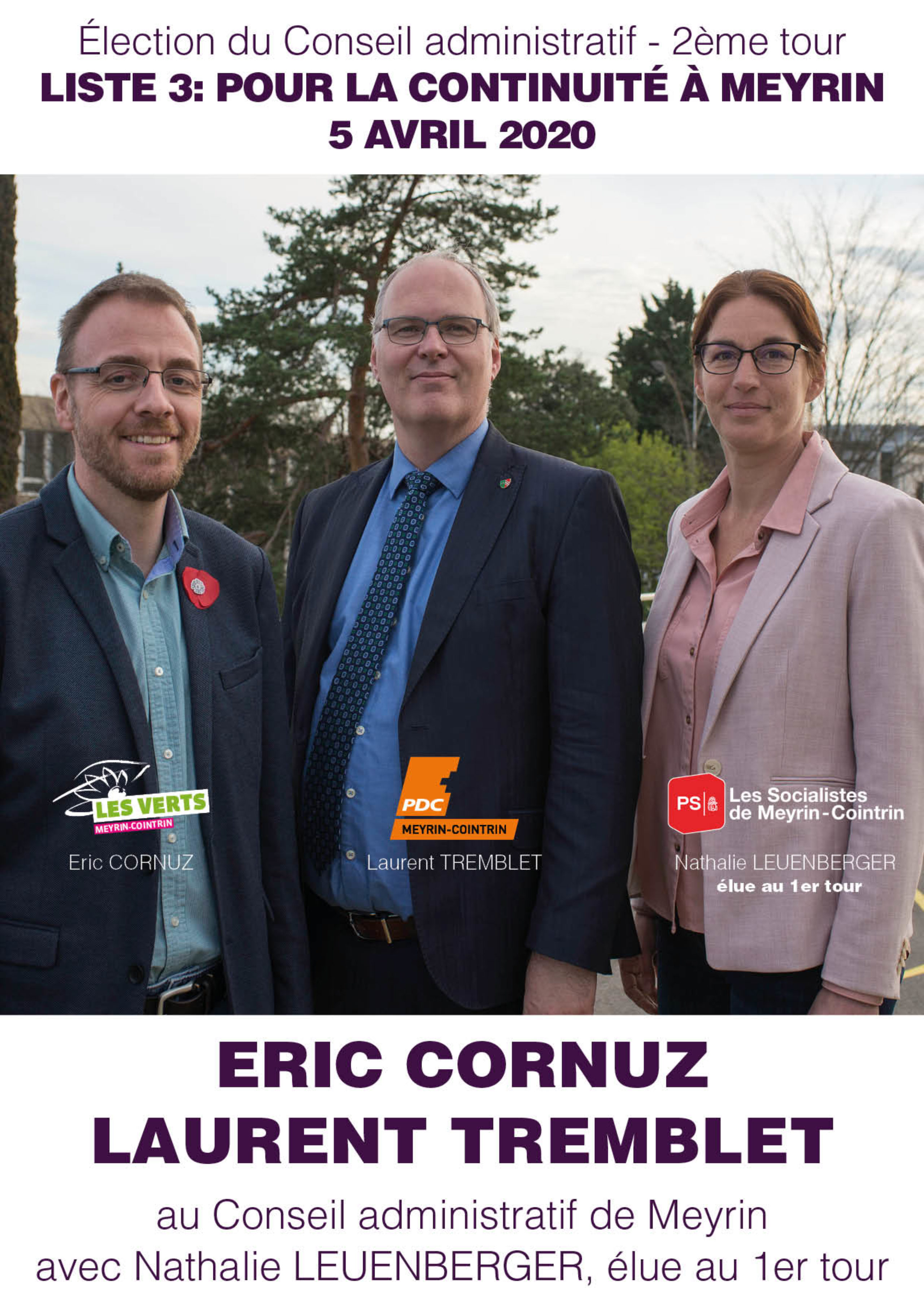 Liste n°3 – Eric Cornuz & Laurent Tremblet au Conseil administratif de Meyrin, avec Nathalie Leuenberger, élue au 1er tour.