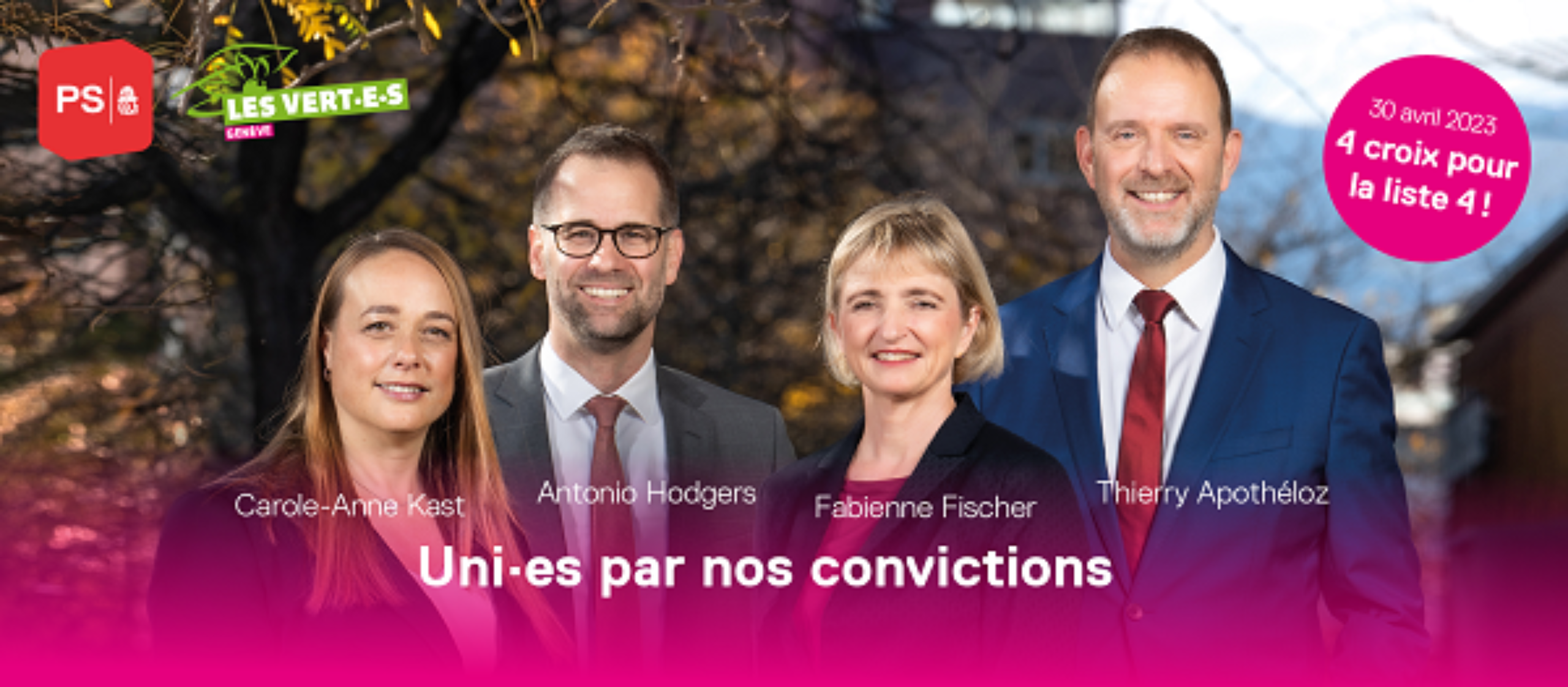 L’alliance avec le parti socialiste s’est avérée fructueuse. Avec nos allié-e-s, nous défendons des valeurs complètement incarnées. La riche diversité de nos listes et de nos élu-e-s en témoigne. Maintenir cette alliance et la confirmer au second tour est crucial pour assurer une majorité de gauche au Conseil d’Etat. Pour ce faire, une seule action : voter strictement le ticket Vert-e-s et Socialistes et ses 4 candidatures, ni une de plus, ni une de moins.